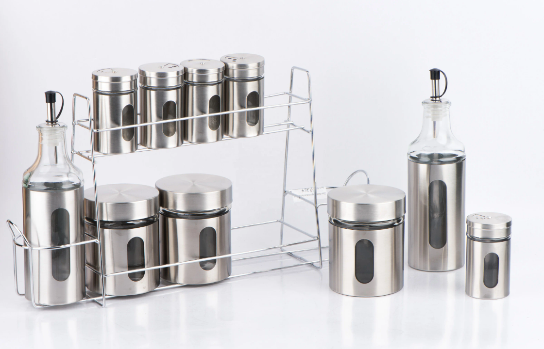 Set de Bocaux et Distributeurs Inox avec Support – Rangement Épices, Sucre, Huile et Condiments